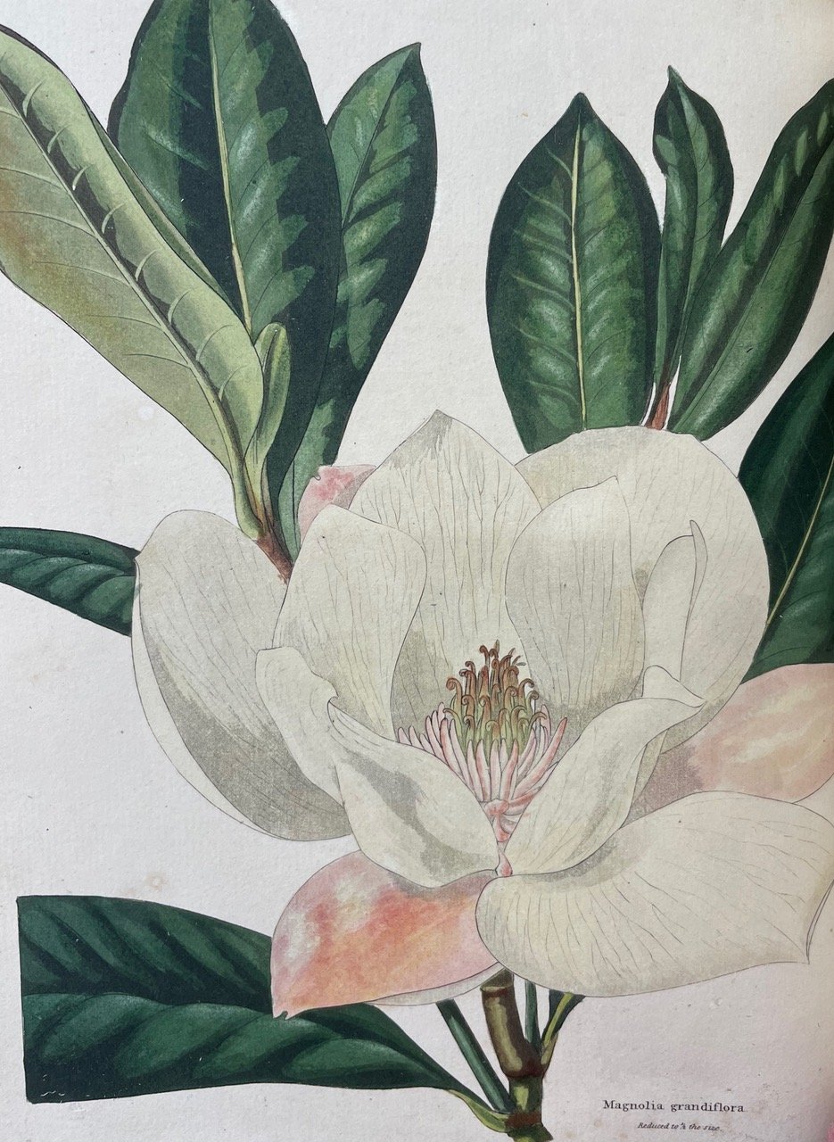 Reproduction from The Botanical Cabinet, Volume IX, 1824, No. 814, Magnolia grandiflora.