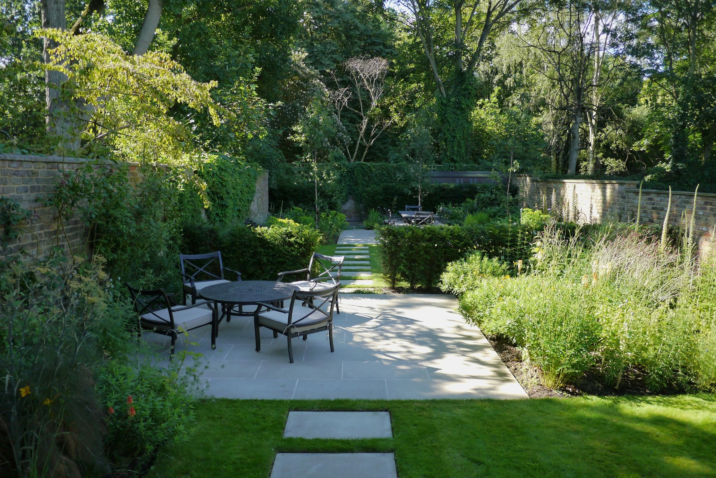 The different zones are separated by yew hedging that will fill out over time and be clipped to give formal structure that will contrast with the softness and slightly wild feel of the perennial planting. Warm honed sandstone was used for the terraces and stepping-stones that connect one area to the next, tying the whole together.